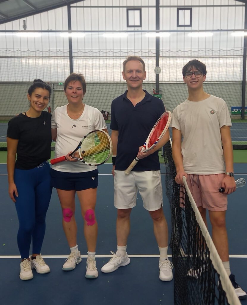 Lustig (siehe Foto) war die Tatsache, dass Robin und Uta erst beim Abschlussfoto realisierten, dass sie ihr Doppel-Match gewonnen hatten, da es 6:3 3:4 ausging, also mit einem gewonnenen und einem (zeitbedingt verkürzten) verlorenen Satz. Daher nochmals zur Info: Bei einem solchen Ergebnis gewinnt derjenige mit der insgesamt höheren Anzahl gewonnener Spiele. Hier also 9:7.